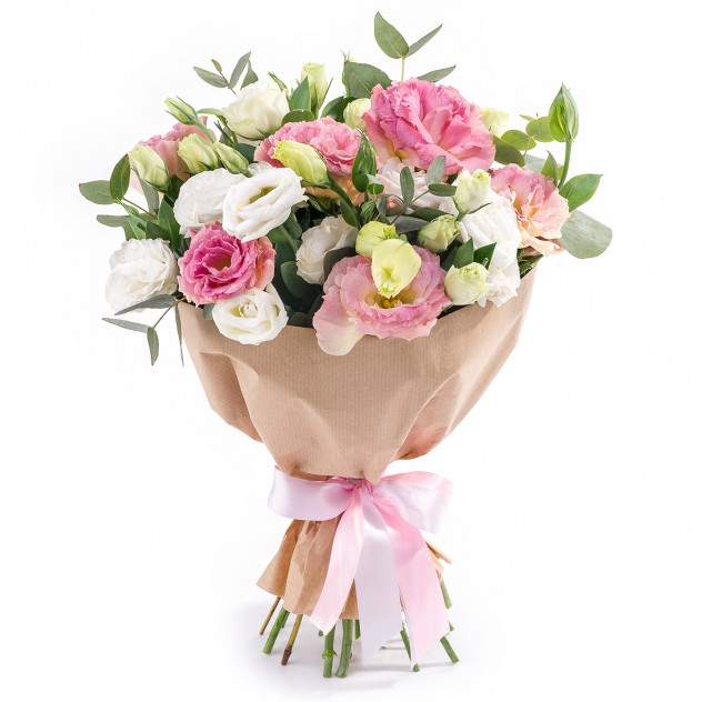 Упаковка для букета: крафт-бумага, Лизиантус 11шт., Эвкалипт 2шт.