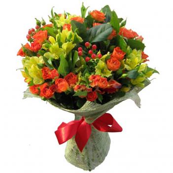 Состав: Роза красная 60 см 15шт., Упаковка для букета: сезаль, Папоротник 5шт., Салал 15шт., Роза желтая 60 см 16шт.