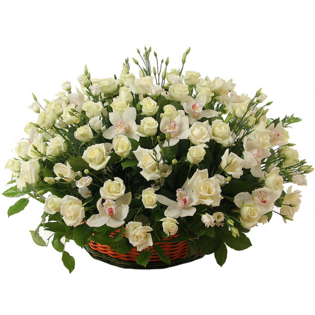 Состав: Упаковка (пленка с лентой), Лизиантус 25шт., Роза белая 60 см 101шт., Салал 40шт., Корзина плетеная, Пиафлор (оазис) 4шт., Орхидея цимбидиум (ветка) 2шт.