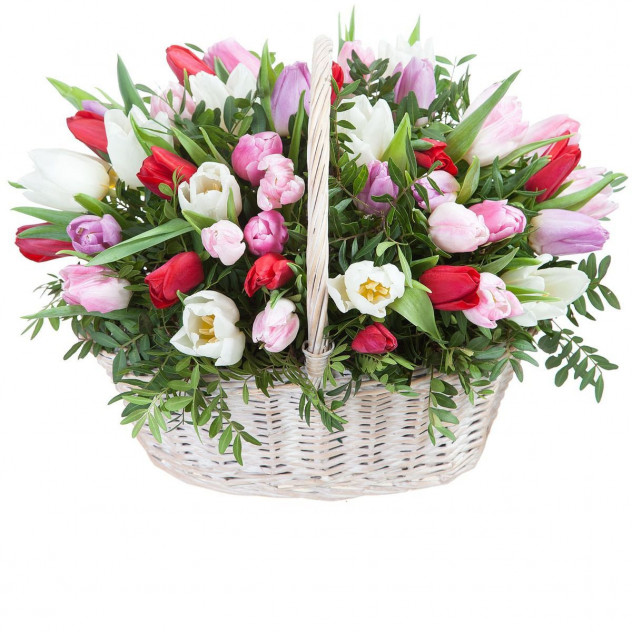 Упаковка (пленка с лентой), Фисташка 8шт., Тюльпан 75шт., Корзина плетеная, Пиафлор (оазис) 2шт., Декор букета и композиции